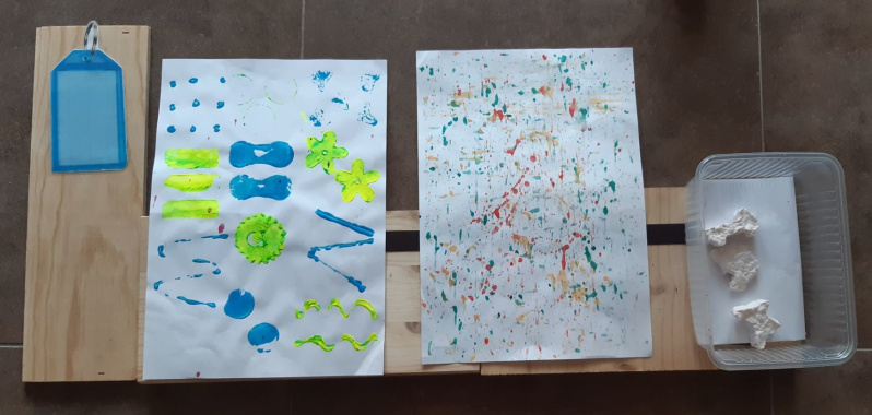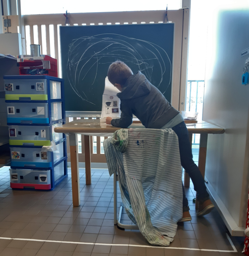 Hierbij heb ik het bord met de concrete voorbeelden verplaatst naar de knutselhoek. Als de kleuter naar de knutselhoek ging, zag die eerst het bord staan en koos de kleuter een activiteit dat hij/zij in de knutselhoek wilde doen. De leerkracht gaf het stappenplan en een materiaalfiche van de activiteit. Hierbij werd er nog altijd hulp aangeboden van de leerkracht. Beetje bij beetje liet de leerkracht de kleuter alleen het materiaal uithalen. Ook werd de kleuter af en toe geobserveerd om te kijken wat er nog kon aangepast worden.